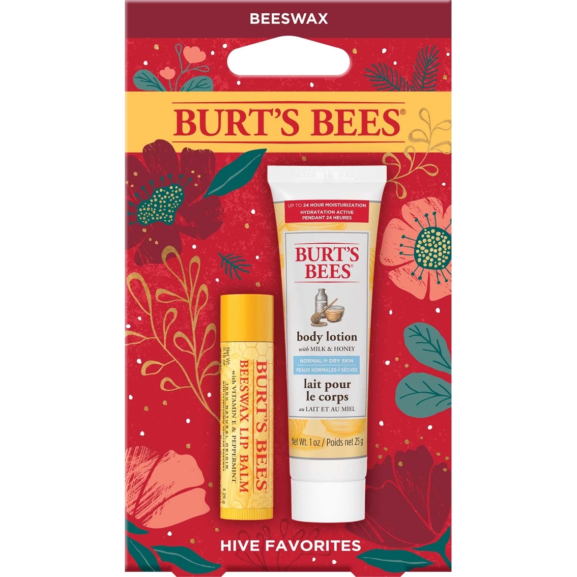 Burt’s Bees Hive Favorites Beeswax Holiday Gift Set contains their most-loved Burt’s Bees body lotion and lip balm. This soon-to-be favorite holiday gift packs in a trial-size tube of Milk and Honey Body Lotion and a tube of Beeswax Lip Balm. Their best body lotion for normal to dry skin, the Milk and Honey Body Lotion, combines luxurious Milk, Honey, Vitamin E, Coconut and Grape Seed Oils to quickly absorb and nourish skin for up to 24 hours. The Beeswax Lip Balm is infused with powerful fruit extracts to make your lips feel juicy, happy and healthy looking. This gift set is beautifully packaged in a Burt’s Bees signature holiday gift bag ready for holiday gifting or just for you. Perfect as a unique stocking stuffer, this natural holiday gift set is sure to surprise and delight everyone on your holiday gift list. Giving comes naturally with this attractive Burt’s Bees signature gift bag.