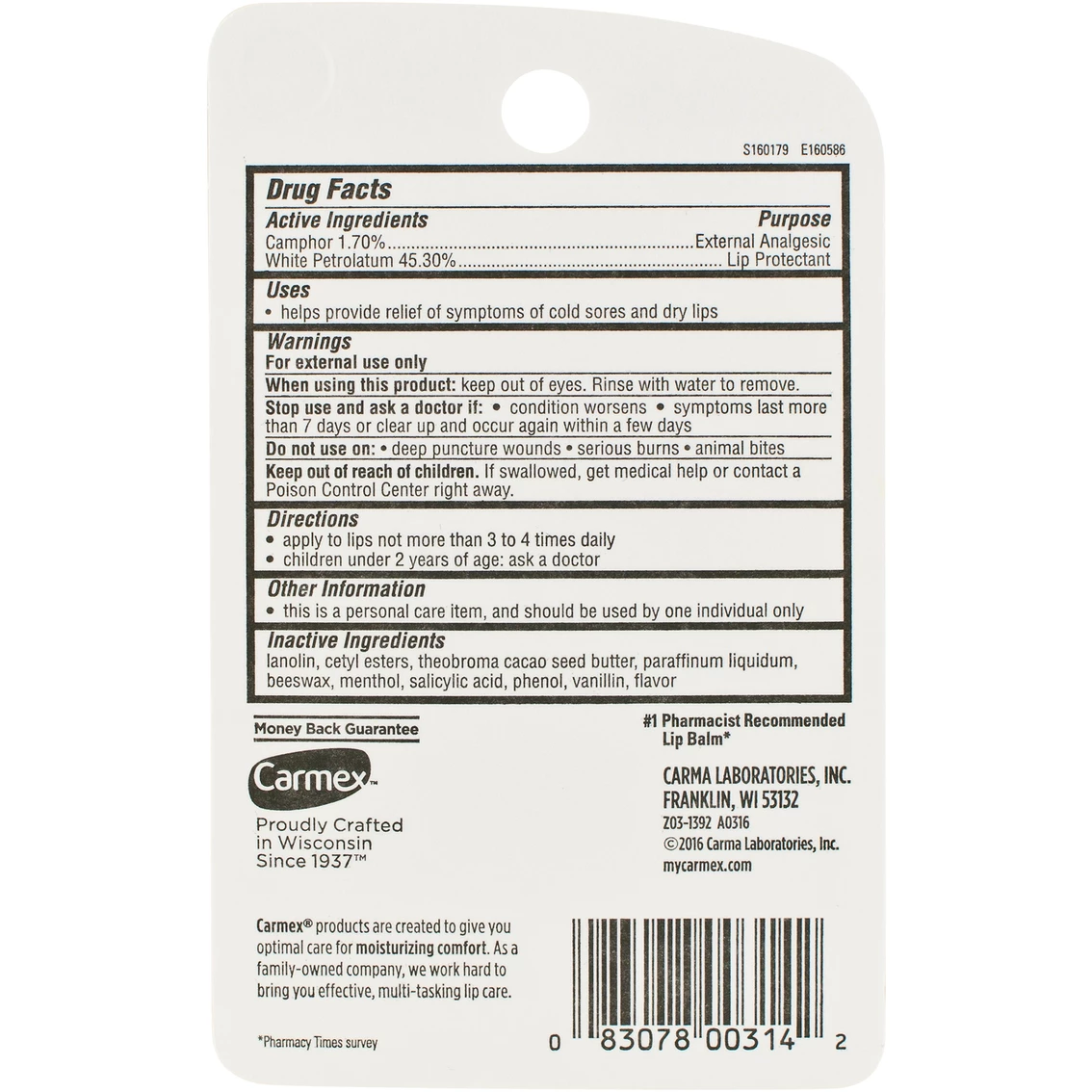 It Soothes. It Heals. It Protects. Suffering from chapped lips and occasional cold sores, Alfred Woelbing invented Carmex lip balm in Milwaukee in the early 1930s. Formulated with a variety of natural ingredients, the mixture was carefully hand poured into small glass jars, which Alfred would sell to pharmacists from the trunk of his car. Over the last 70 years, people have come to love the lip balm that works like no other. Original formula tube. Ultra moisturizing to your lips. Provides long-lasting protective barrier to help promote healing. Glides on smoothly to help soften and hydrate lips with moisturizing cocoa butter. Cools and soothes lips with camphor and menthol.