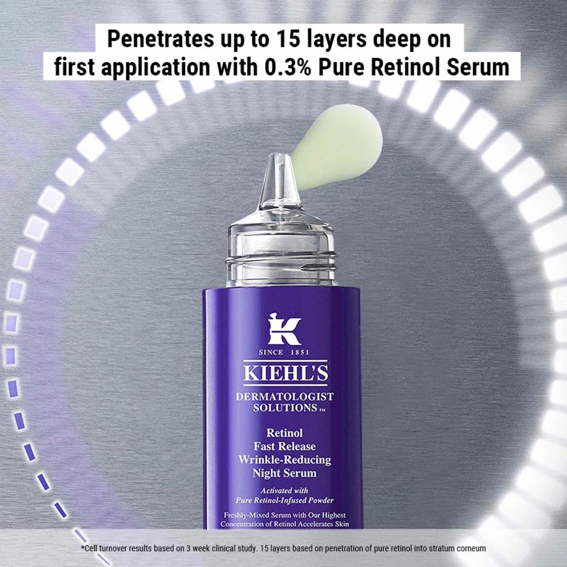 The Kiehl’s Retinol Fast Release Wrinkle Reducing Night Serum is the first pure retinol that is freshly activated to release a 0.3% night serum into skin faster than standard retinol, delivering maximum potency for results in 5 days.