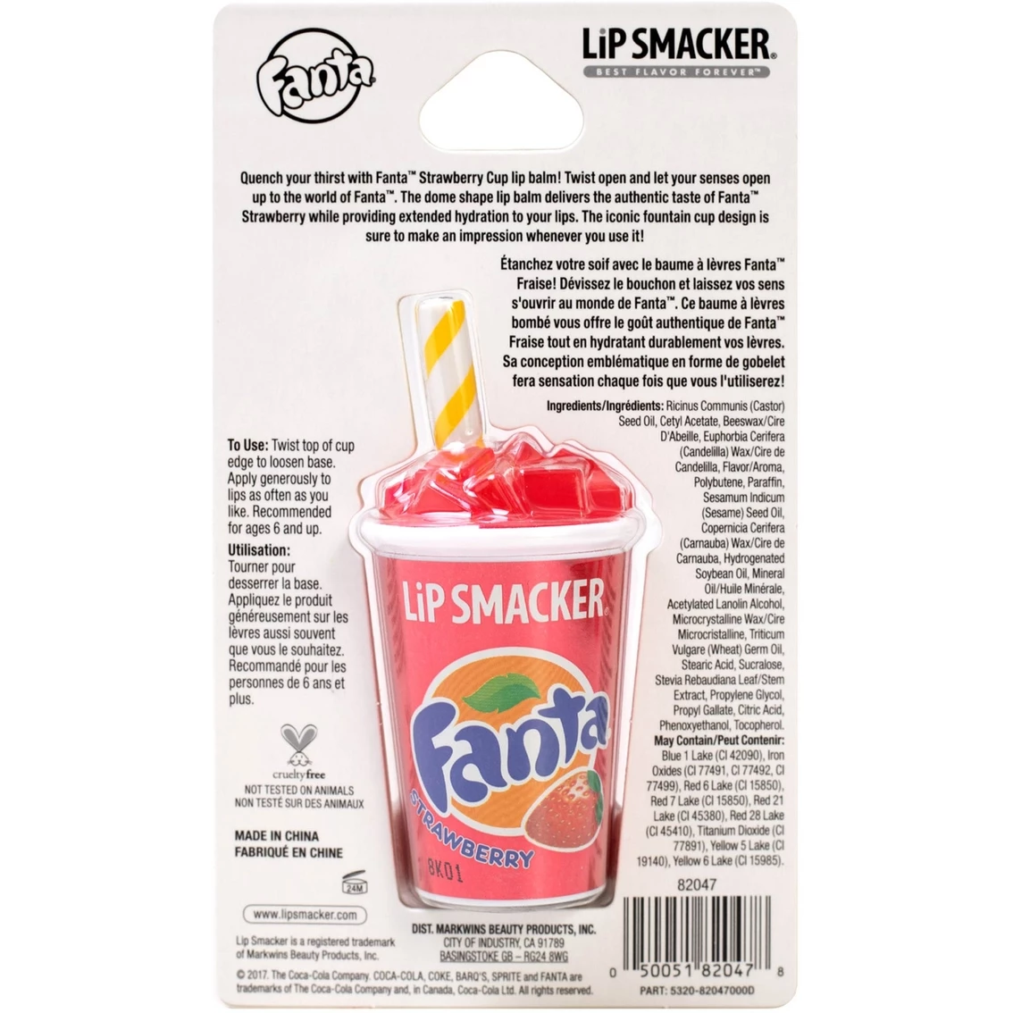 Quench your thirst with a Fanta Strawberry Cup lip balm, brought to you by Lip Smacker! Twist open and open your senses to the world of Coca-Cola. The dome-shaped lip balm delivers the authentic taste of Fanta Strawberry while providing extended hydration to your lips. The iconic fountain cup design is sure to make an impression whenever you use it!
