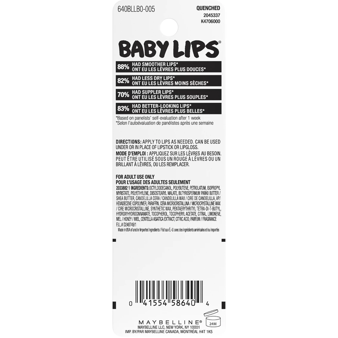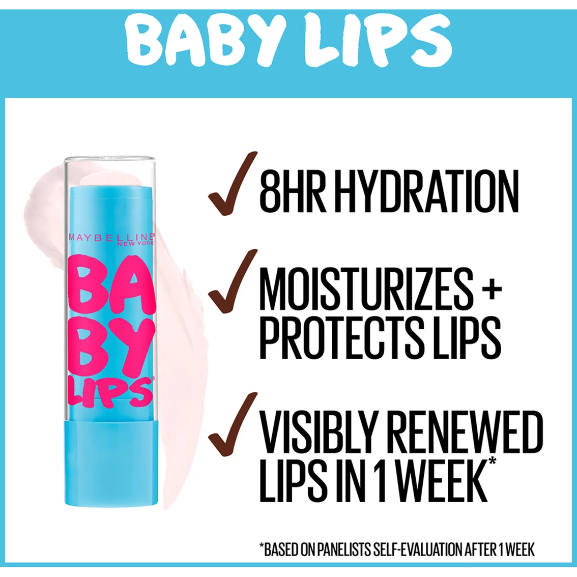 Maybelline New York Baby Lips Moisturizing Lip Balm provides 8 hour moisture plus lip renewal. Moisturizing lip balm with SPF 20 sunscreen. Visibly renews lips in 1 week: *88% had smoother lips. *82% had less dry lips. *70% had suppler lips.*83% had better looking lips.* It’s clinical care for baby soft lips! *Based on panelists self-evaluation after 1 week.