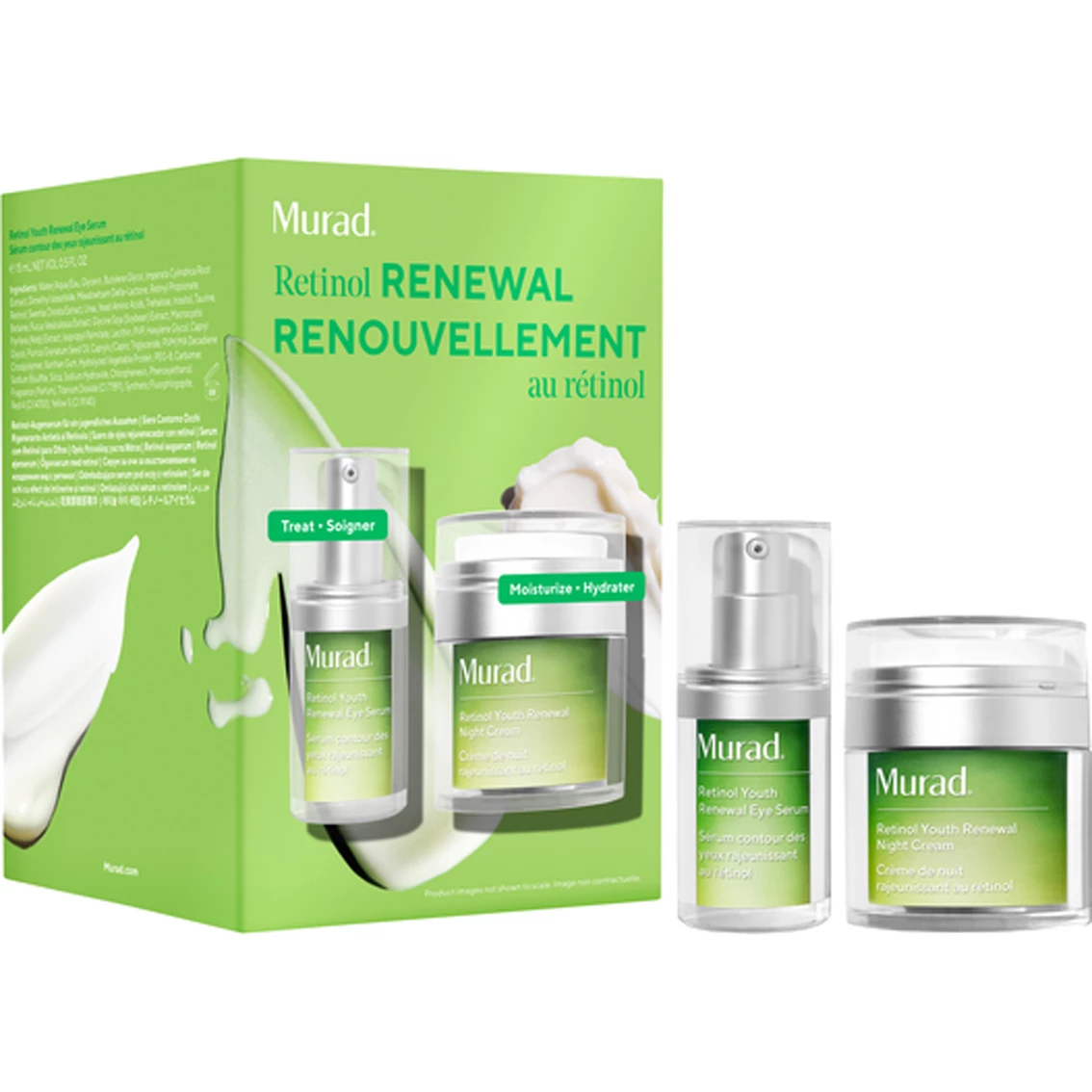 The Retinol Renewal Value Set includes fast-acting full sizes of Murad’s clinically proven Retinol Eye Serum and Night Cream. The Retinol Eye Serum improves the look of wrinkles all around the eyes including lids. The Retinol Night Cream improves the look of youthful contours and wrinkles while hydrating the skin.