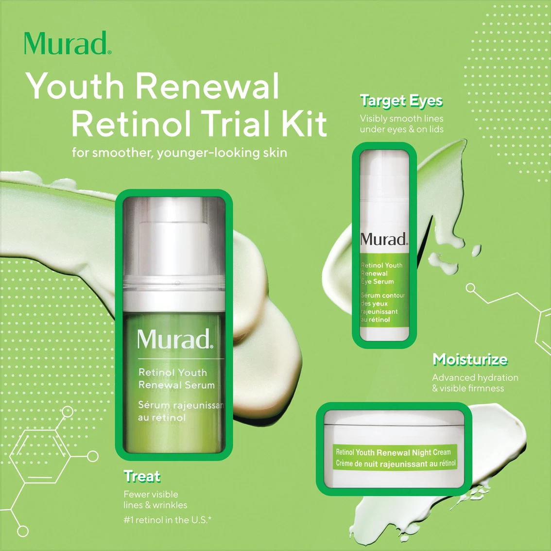 Visibly minimize the appearance of lines and wrinkles for smoother, younger-looking skin with the Murad Youth Renewal Retinol Trial Kit. Retinol serum and retinol night cream work three times better when used together*. Kit includes 3 trial sizes to minimize lines and wrinkles. 93% saw a reduction in lines and wrinkles in just 2 weeks with Retinol Youth Renewal Serum. 93% saw a reduction in lines and wrinkles in just 4 weeks with Retinol Youth Renewal Eye Serum, the number one Retinol eye serum in the U.S. plus 83% noticed firmer, more supple skin in just 4 weeks with Retinol Youth Renewal Night Cream, the number one Retinol night cream in the U.S. *Vs serum alone.