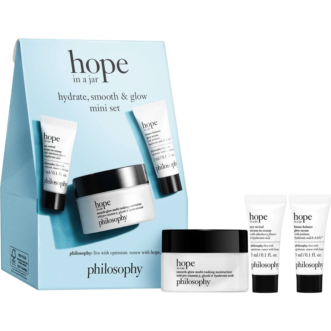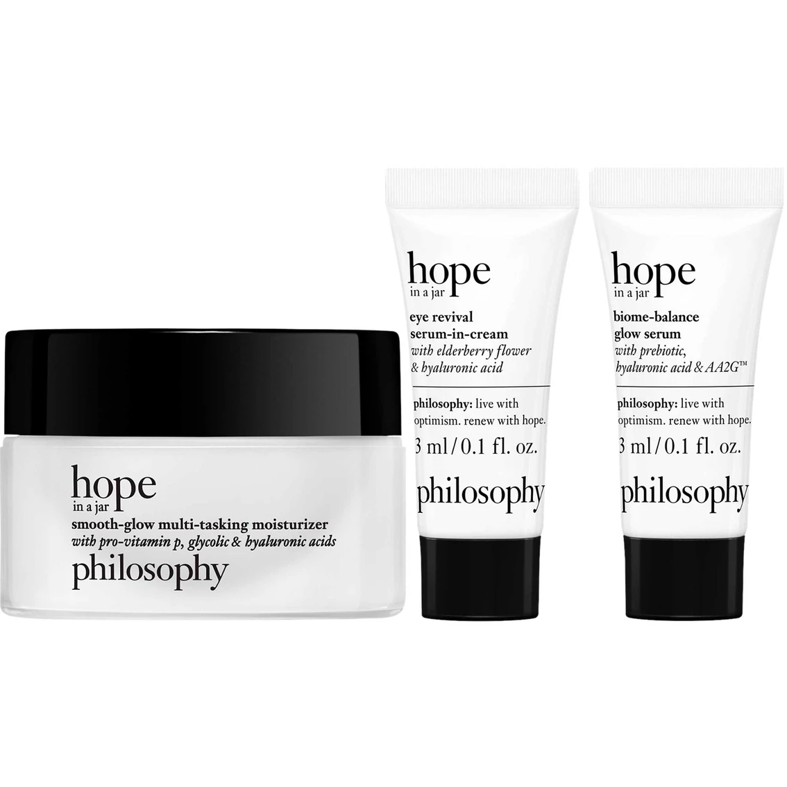 Philosophy: Live with optimism, renew with hope. The Philosophy Hope in A Jar Hydrate, Smooth and Glow Mini 3 pc. Set contains: 0.5-oz. Hope in a Jar moisturizer, 3ml eye balm and 3ml serum.