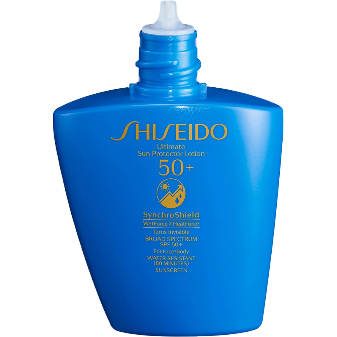 Shiseido Ultimate Sun Protector Lotion SPF 50+: Invisible SPF 50+ sunscreen with a protective veil that becomes even more effective in heat and water.* An ocean-friendly formula for face and body that keeps pace with active and outdoor activities.